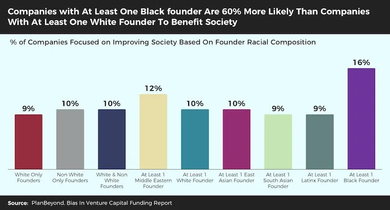 The report highlights a few of the types of companies working to improve society as a whole, and also points out that this work is not done equally by all founders. In fact, women and Black-led companies are more likely to build these types of companies.