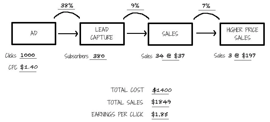 After that, let’s say 7% of your buyers also purchase your $197 offer in Step 5, which brings your total sale to $1,258 + (3 x $197) = $1,849. This equates to $1.85 earnings/click which is greater than your cost of $1.40/click. You have a winning campaign where you’re making a profit!